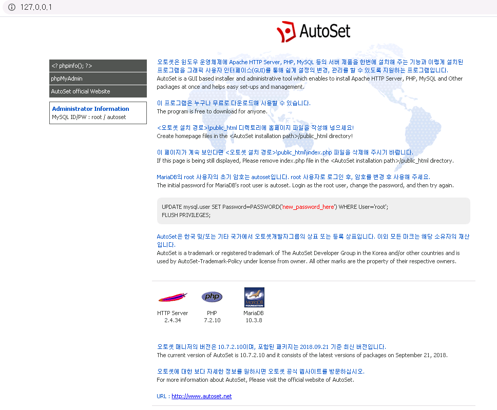 사용자명은 root 암호는 autoset 을 입력해서 로그인을 합니다.