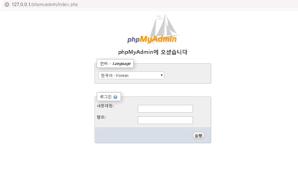 데이터베이스를 관리하는 phpMyAdmini 접속 페이지가 나오는데요.