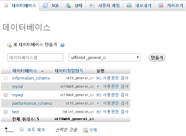 저는 mywp 라는 이름으로 데이터베이스를 만들어 보겠습니다.