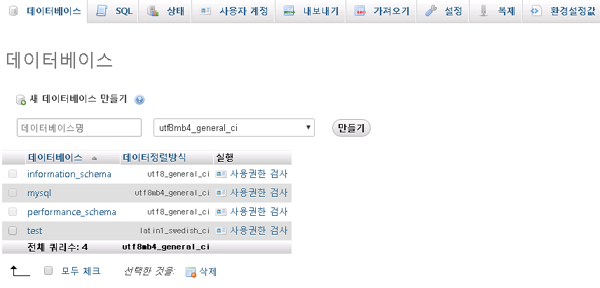 데이터베이스명에 mywp를 입력하고 만들기를 누르면