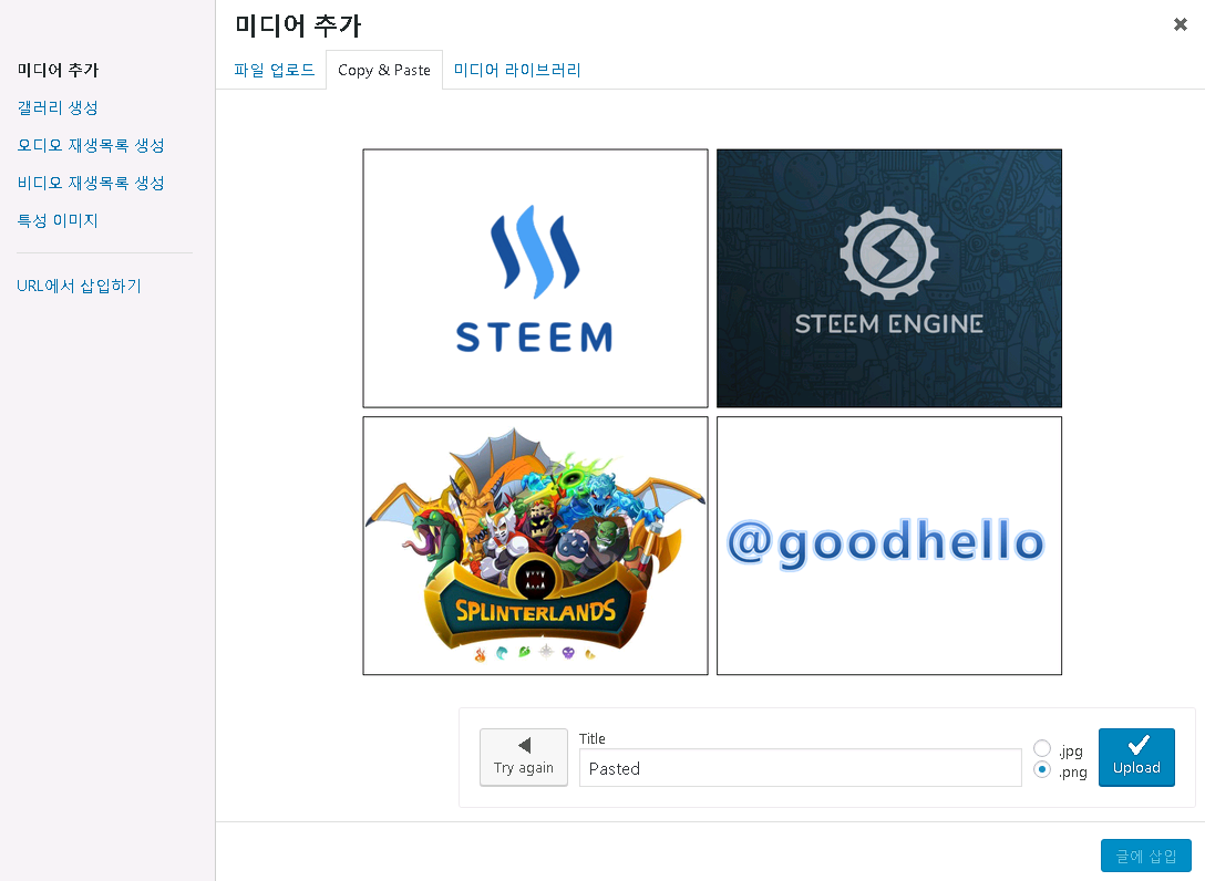 그러면 이제 미디어를 추가할때 Copy & Paste 기능을 통해 클립보드에 있는 이미지를 바로 업로드하고