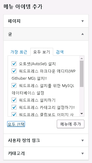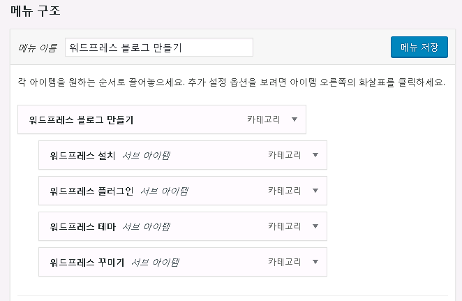 이제 워드프레스 블로그 만들기 메뉴에 현재까지 생성된 카테고리 분류를 마쳤습니다.