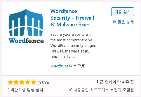사이트 관리자에서 플러그인 새로추가에 들어가서 wordfence 플러그인을 찾아서 설치하고 활성화를 시켜줍니다.