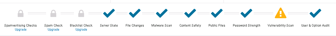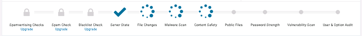 프리미엄 전용 기능인 Spamvertising Checks, Spam Check, Blacklist Check 를 제외하고 Server State, File Changes, Malware Scan, Content Safety, Public Files, Password Strength, Vulnerability Scan, User & Option Audit 항목에 대해 검사가 이루어지고 있습니다.