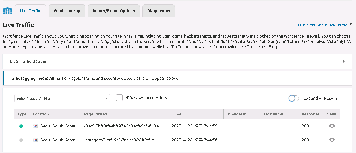 Wordfence 도구(Tools)에 들어가보면 Live Traffic을 확인할 수 있는데, 어떤 페이지에 접속해서 무엇을 했는지 여부를 감시해 줍니다.