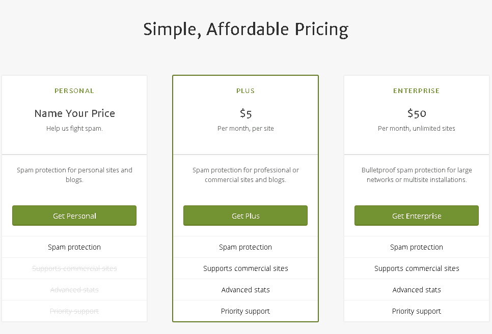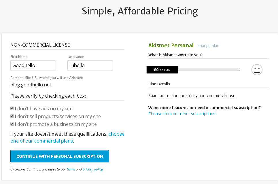 Akismet 무료버전은 오로지 비 상업용 사이트에 스팸 방지 기능만 제공하며, 상업용으로 사용하시려면 유료 버전을 사용해야 할 것 같습니다.