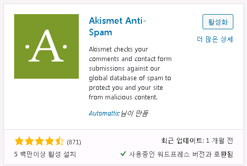스팸 댓글을 방지하는 Akismet 플러그인은 워낙 많이 사용되기 때문에 현재 워드프레스를 설치할때 포함되어 있기도 하더군요.