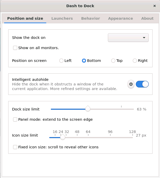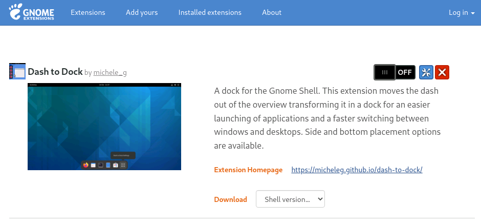 A dock for the Gnome Shell. This extension moves the dash out of the overview transforming it in a dock for an easier launching of applications and a faster switching between windows and desktops. Side and bottom placement options are available. 확장 홈