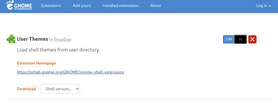Load shell themes from user directory. 확장 홈페이지 https://gitlab.gnome.org/GNOME/gnome-shell-extensions 다운로드 쉘 버전… 확장 버전… 여러분의 의견 안타깝게도, 댓글을 달거나 오류를 보고하려면 스팸을 막을