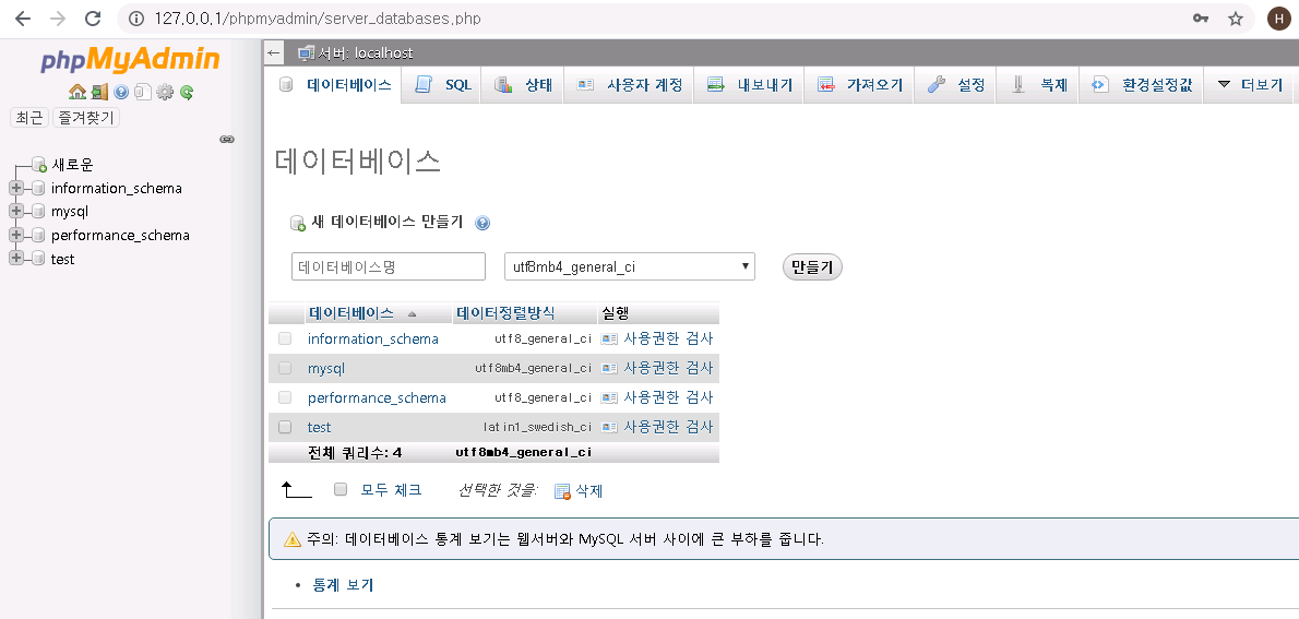 새 데이터베이스 만들기 아래에 데이터베이스명을 입력해 주시고
