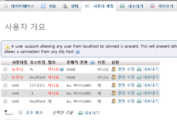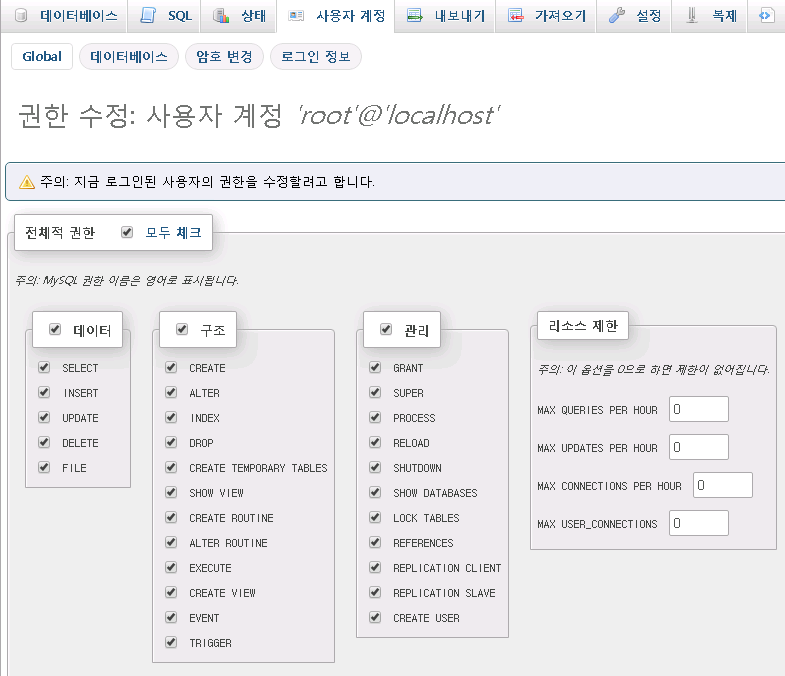 root localhost 라인의 권한 수정을 클릭 해줍니다.