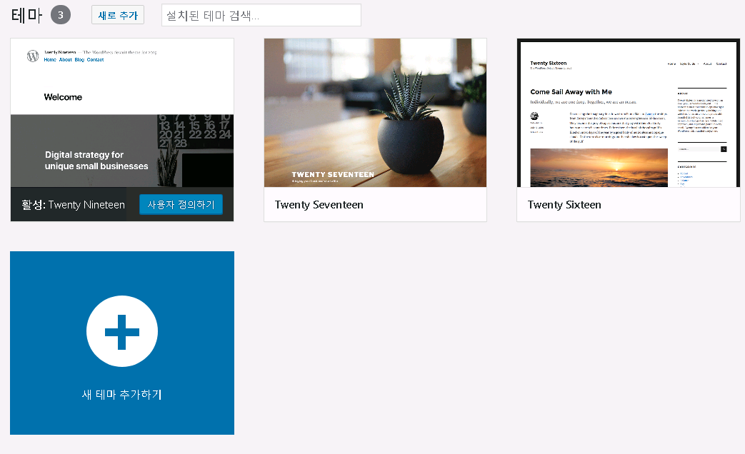 그러면 테마 페이지로 이동하게 되는데, 기본적으로 Twenty Nineteen, Twenty Seventeen, Twenty Sixteen 테마가 깔려 있네요.