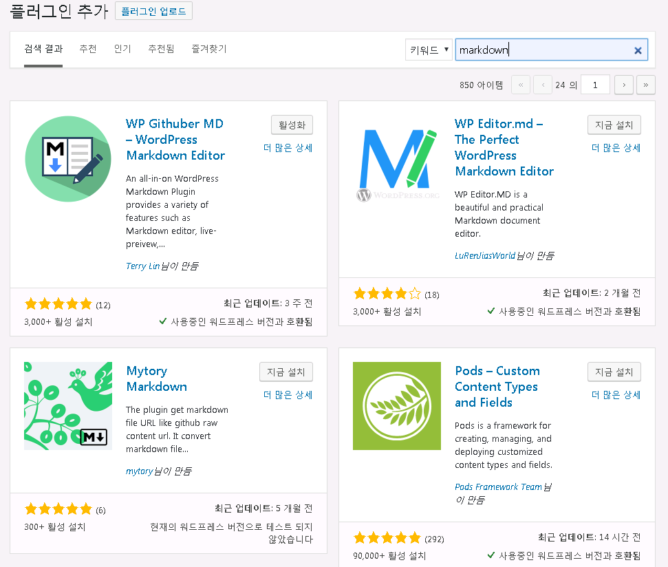 이 중에서 저는 WP Githuber MD – WordPress Markdown Editor 플러그인을 사용해 보려고 합니다.
