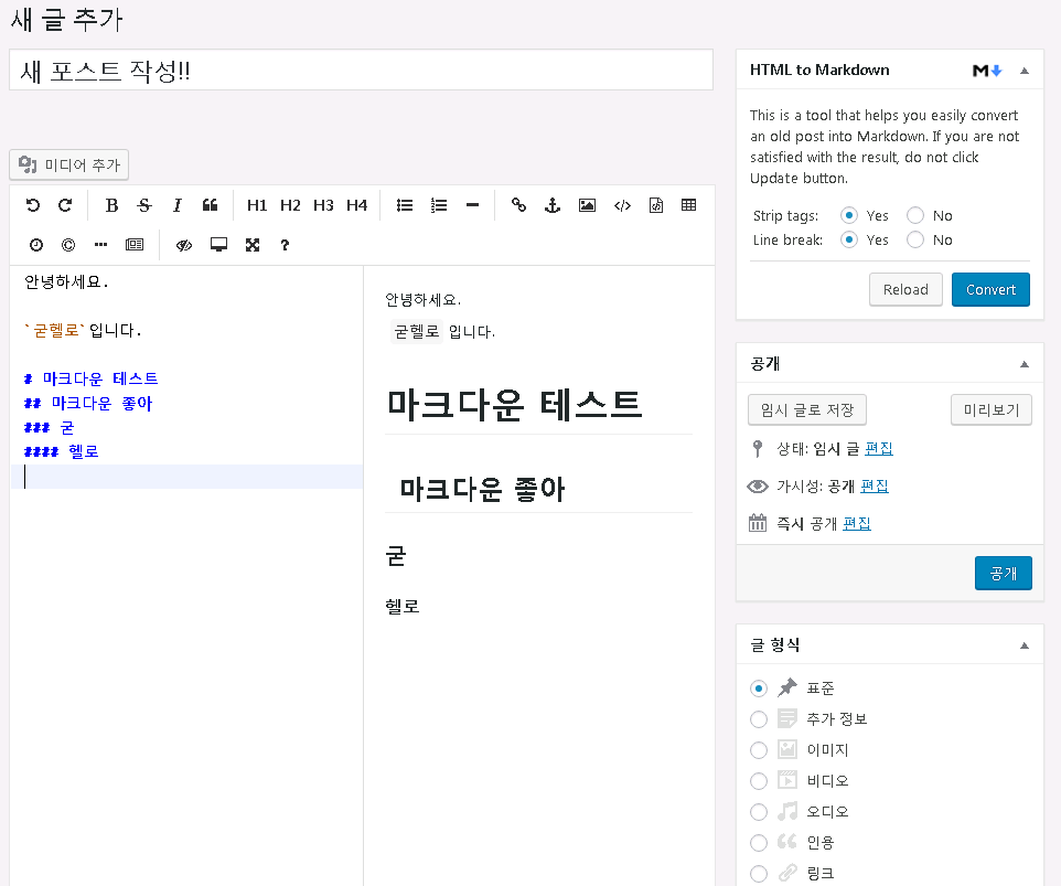 워드프레스 마크다운 에디터(WP Githuber MD) 적용 완료!!