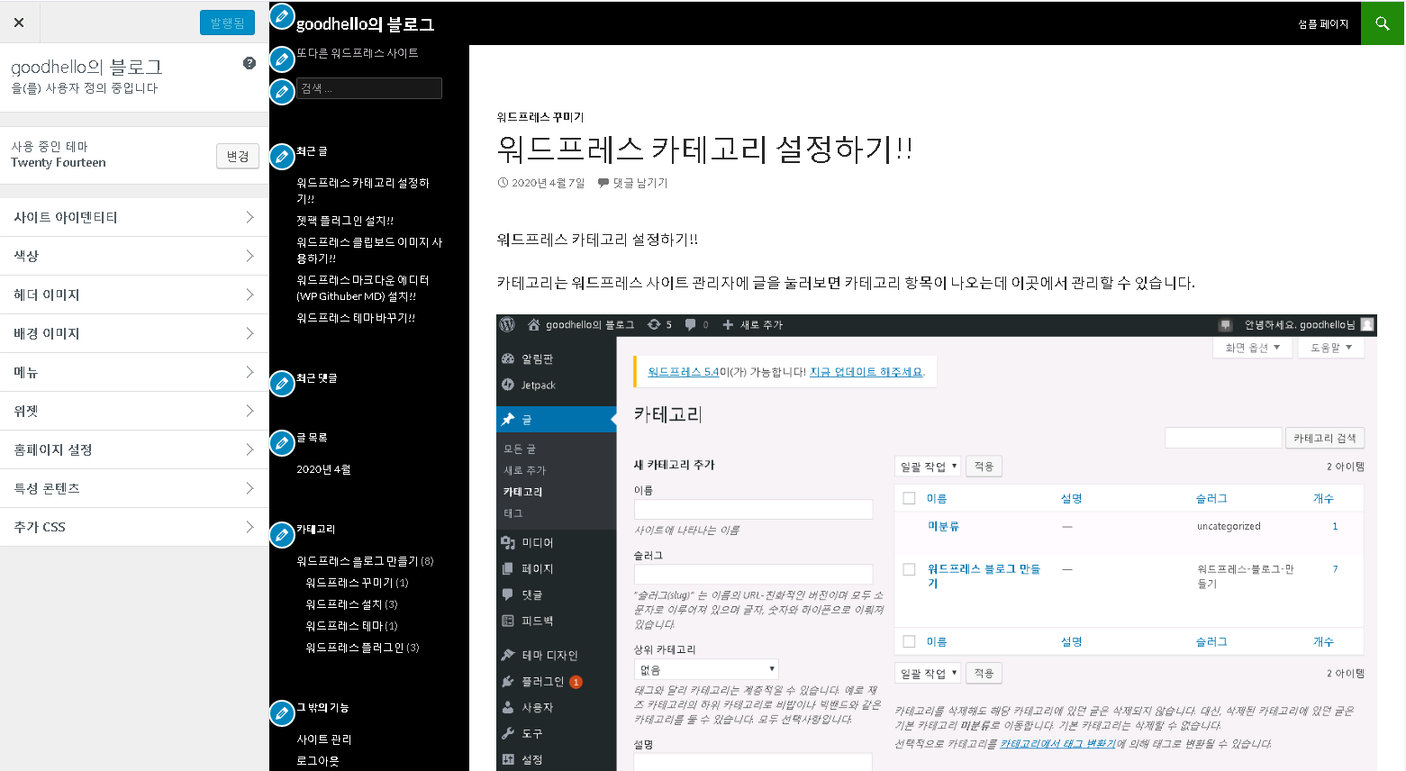 현재 사용중인 Twenty Fourteen 테마를 바로 변경할수도 있구요.