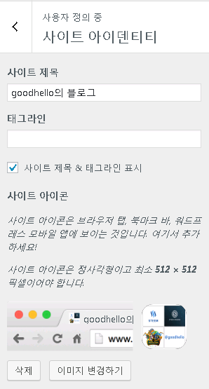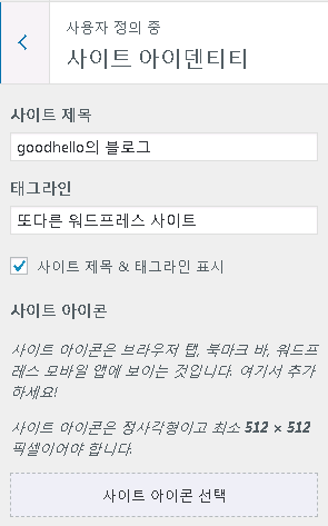 사이트 아이덴티티에서는 사이트 제목과 태그라인, 사이트 아이콘을 선택할 수 있습니다.