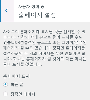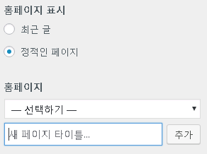 홈페이지 설정에서는 홈페이지에 표시되는 내용을 최근 글 혹은 정적인 페이지로 바꿀수 있는데요.