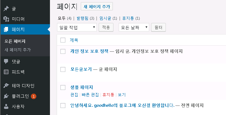 사이트 관리자의 페이지 메뉴에 들어가보면 샘플 페이지가 보이는데, 얘를 휴지통으로 보내버리겠습니다.