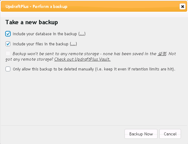 UpdraftPlus 은 백업을 위해 2가지 옵션을 제공하고 있는데, 하나는 백업에 데이터 베이스를 포함할 것인지, 또 하나는 백업에 파일을 포함할 것인지를 선택할 수 있습니다.