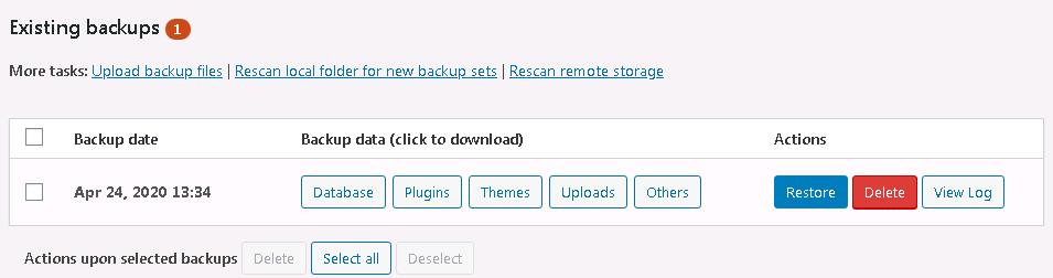 그리고 위에선 보는 것 처럼 백업 리스트를 확인할 수 있는데, 이를 통해 백업으로 복구를 실행하거나, 데이터베이스, 플러그인, 테마 등의 파일을 개별적으로 내려받거나 관리할 수 있습니다.