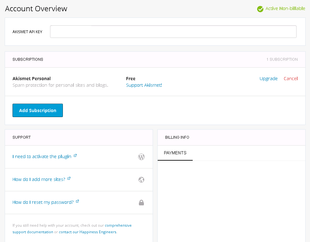 Akismet 무료버전은 오로지 비 상업용 사이트에 스팸 방지 기능만 제공하며, 상업용으로 사용하시려면 유료 버전을 사용해야 할 것 같습니다.